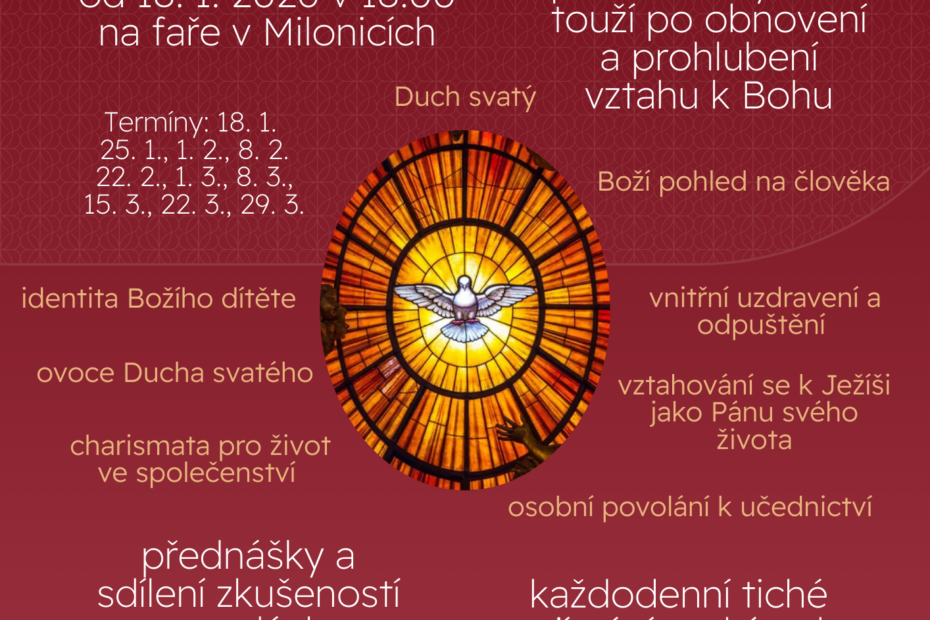 Na první měsíce roku 2026 připravuje pastorační rada farností Milonice, Dobročkovice a Nemotice seminář „Život v Duchu“. Ten je určený pro křesťany, kteří touží po obnovení a prohloubení svého vztahu k Bohu… Číst dále »Seminář Život v duchu od 18. 1. 2026 na faře v Milonicích