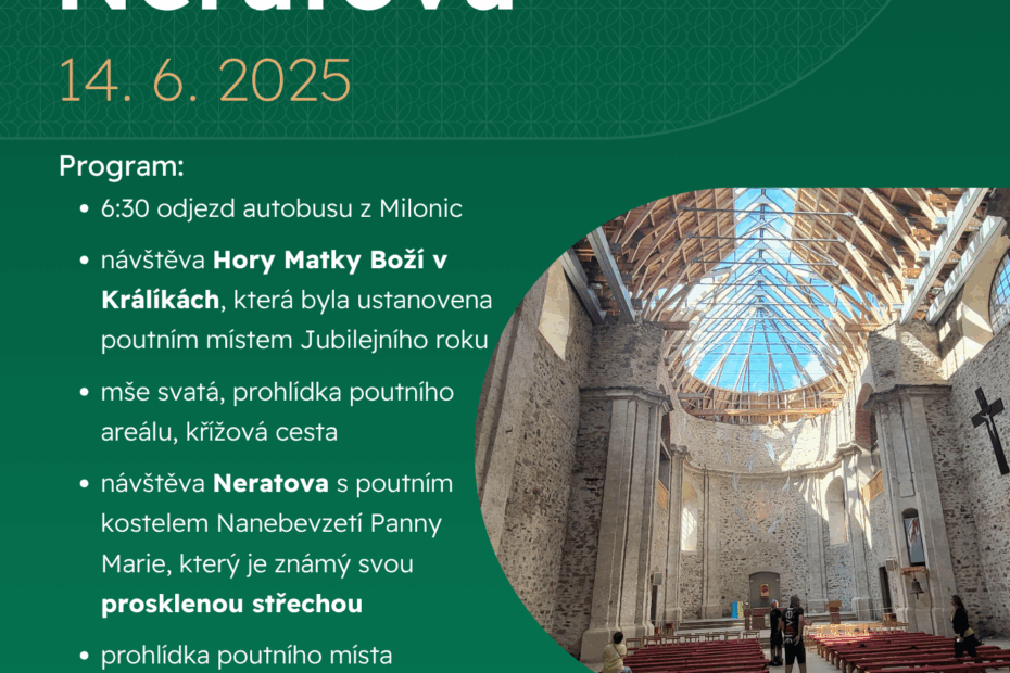 V Jubilejním roce 2025 zvou farnosti Milonice, Dobročkovice a Nemotice na pouť do Králíků a Neratova. Pouť se se uskuteční v sobotu 14. 6. 2025. Cena za dopravu bude cca 600-700 Kč/osobu… Číst dále »Farní pouť do Králíků a Neratova 14. 6. 2025