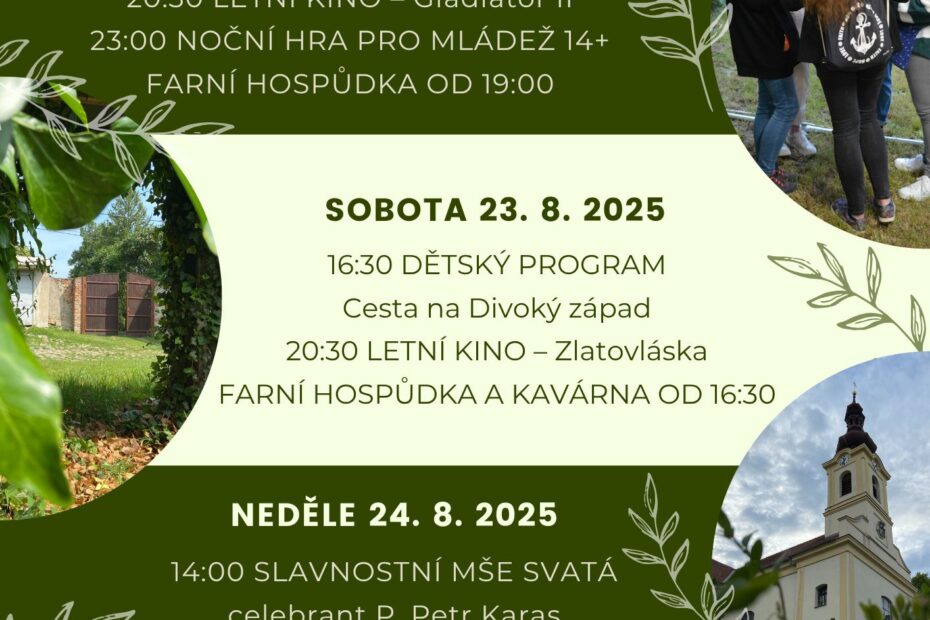 Rádi bychom Vás pozvali na 29. Zahradní slavnost do Milonic. Pátek 22. 8. Celá akce začne v 18:00 mší svatou na farní zahradě, kterou bude celebrovat P. Miroslav Slavíček, odcházející farář farností… Číst dále »Zahradní slavnost v Milonicích 22. – 24. 8. 2025