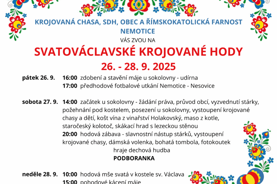 Římskokatolická farnost Nemotice Vás srdečně zve Svatováclavské krojované hody o víkendu 26. – 28. září 2025. Hodová mše svatá se uskuteční v neděli 28. září 2025 v 10:00 v kostele sv. Václava.